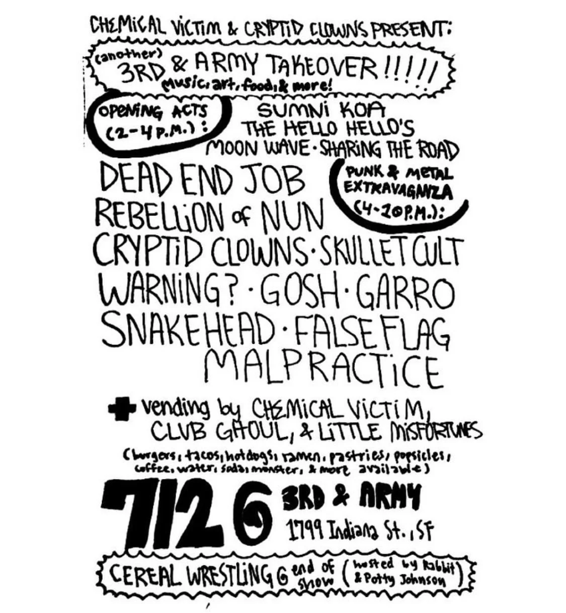 ALL-DAY 3RD & ARMY TAKEOVER: Sumni Koa, The Hello Hellos, Moon Wave, Sharing the Road, Dead End Job, Rebellion of Nun, Cryptid Clowns (some shitty ass band), Skullet Cult, Warning?, Gosh, Garro, Snakehead (some shitty ass band), False Flag (some shitty ass band), Demoura (not listed on flyer), and Malpractice, 7/2/2022 at 3rd & Army Skatepark, San Francisco, CA