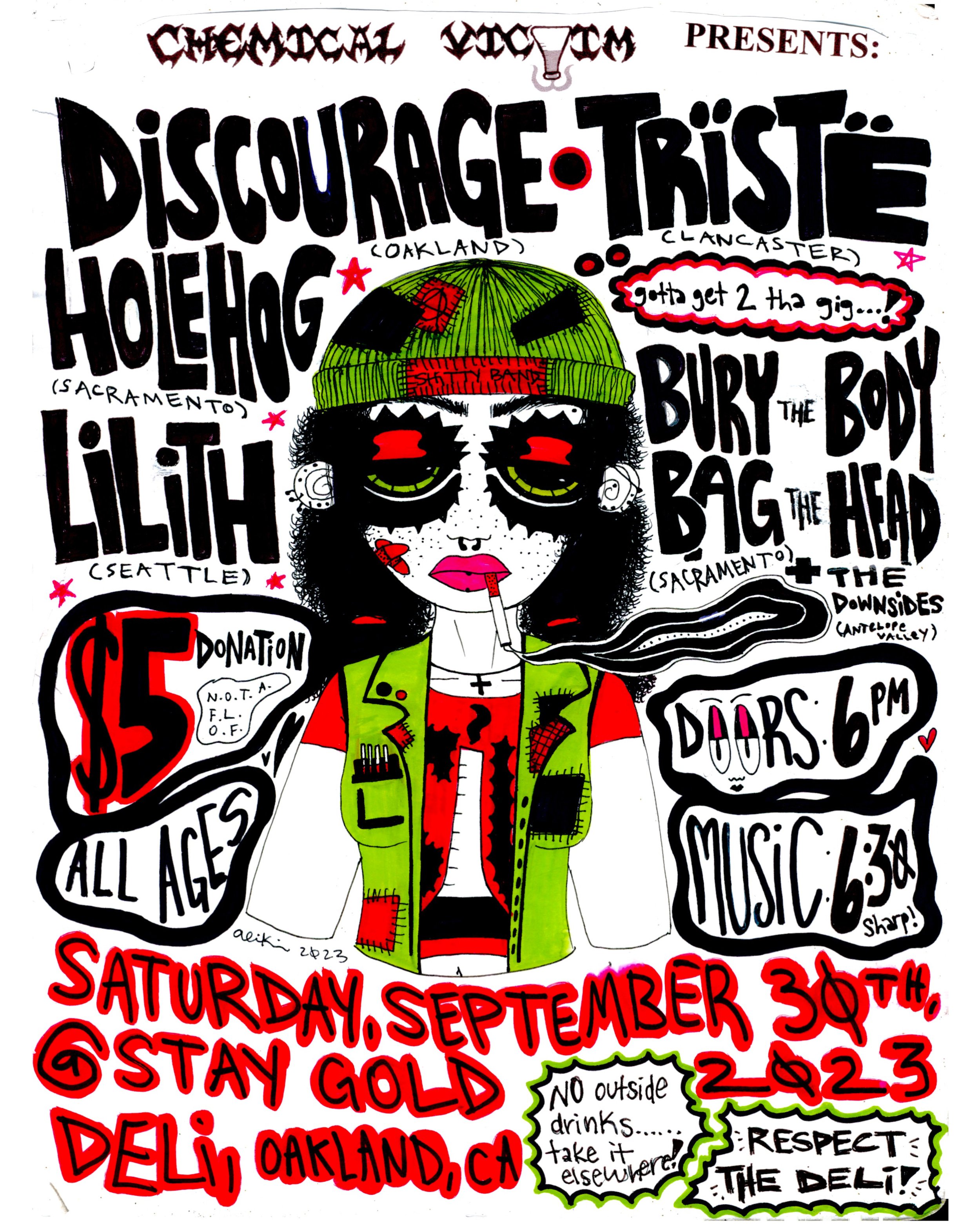 Discourage, Triste, Holehog, Lilith, Bury the Body Bag the Head, and The Downsides, 9/30/23 at Stay Gold Deli, Oakland.