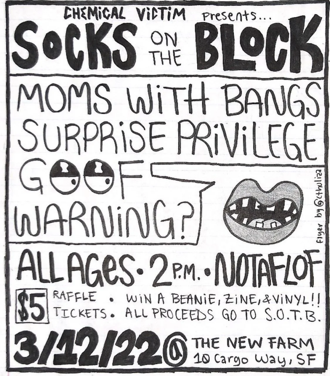 Socks on the Block Saturday, March 12, 2022 2:00 PM 7:00 PM The New Farm 10 Cargo Way San Francisco, CA, 94124 United States (map) Google Calendar ICS SOCKS ON THE BLOCK BENEFIT SHOW: Moms with Bangs, Surprise Privilege (some shitty ass band), Warning?, and Goof (some shitty ass band), 3/12/2022 at The New Farm, San Francisco, CA